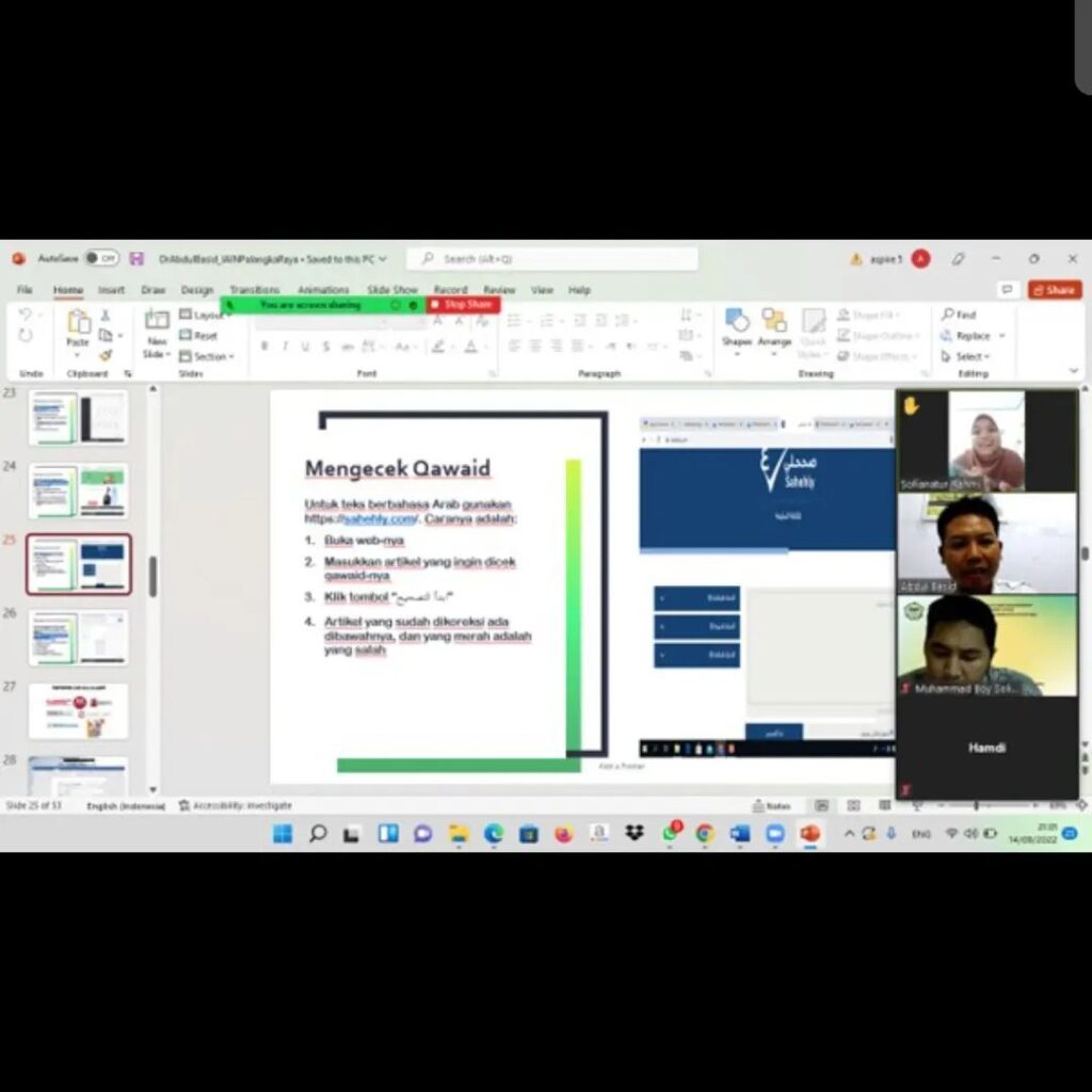 اشترك قسم اللغة العربية وآدابها برنامج نشر بحوث المحاضر مع الطلبة الذي عقد افتراضيا يوم الجمعة 9 سبتمبر 2022م. هذه العملية هي البرنامج الأسبوعي الذي عقدته معهد دراسة اللغة والثقافة كلية العلوم الإنسانية تحت إشراف أستاذة سري منيرة. هناك ثلاثة محاضرين في هذه المناقشة، هم ويدا راسيتاما، وأنوار مسعدي، ومحمد